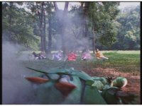 Lying on the ground, smoking, Red nod-talks and punches the ground, Pink doing the same next. |