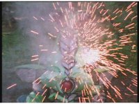 Preying Mantis fires some energy twirls at the Rangers, spark bursting before them, but Red, Silver, & Pink rush through the smoke unharmed. |
