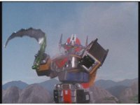 Preying Mantis rushes forth, tries to punch Mega Voyager, but gets blocked, punched back, then blocked again, before the Megazord grabs him tightly and pitches him into the air. |