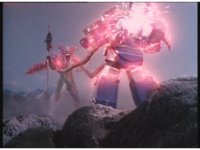 Coralizer unleashes tentacles from his shoulders, wrapping them around Astro Megazord's arms, sending a jolt of reddish electricity that electrocutes it. |