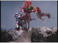Astro Megazord lands before Coralizer, facing it with its Saber, both pacing to the right. |