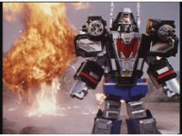 The Delta Megazord chest piece locks onto Astro Megazord's body. |