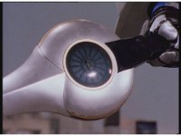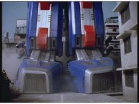 Close-up of the Astro Megazord head connecting, eyes lighting up, as the Rangers in the cockpit window remain seated. |