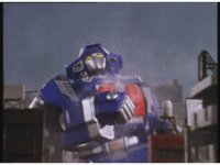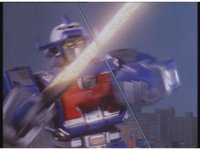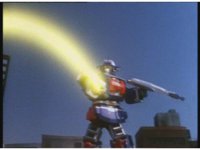 Track in, upward angle, on Astro Megazord raising Saber, then slowly lowering it in victory. |