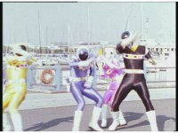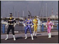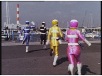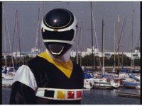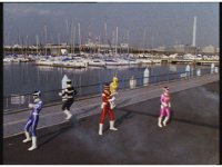 The four Rangers rush into the harbor area, looking around, Blue talking, then Black. |