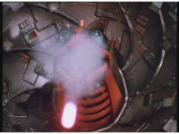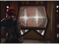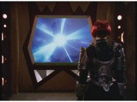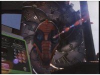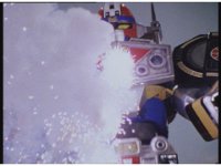 Datascammer falls, but gets up, and does his light flashing attack on Mega Voyager, overwhelming it and the Rangers within. |