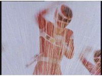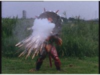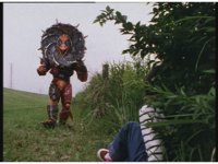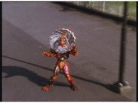 Psycho Red keeps Red pinned down, as he slowly raises his sword and is about to strike at the downed Ranger, when a burst of smoke knocks him off of prey. |