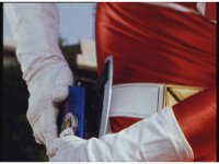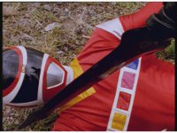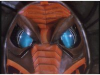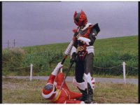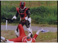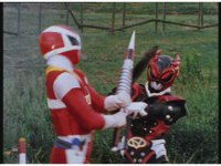 Red rolls right back up, then leaps up and goes to Spiral Saber stab Psycho Red, who grabs the weapon, tries to hit back, but is unable to do so, so he merely flips the Ranger onto his back, pins down his arm and puts his sword beside his head. |