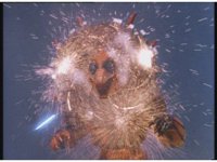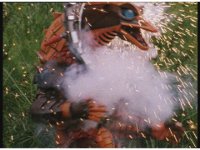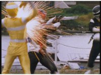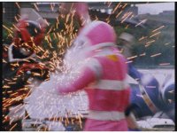 Continued from two shots ago, Datascammer talks and arm jerks a little more, then fires spark blasts from his mouth, bursting the Rangers off their feet. |