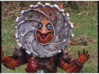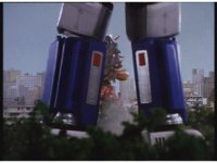 Mega Voyager lands and poses battle ready before Datascammer, who hobbles forth, tries to strike, gets his arm smacked, beak grabbed, kicked repeatedly, then flung aside. |