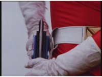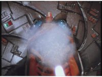 Zoom in on Red in the cockpit, spreading arms, crossing them, then pointing forth, before grabbing controls. |