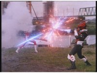 Continued, Red twirls his Spiral Saber down and pulls out his Astro Blaster, firing it on Psycho Red, who dodges, blocks, and fires his own electricity back, sparking him down. |
