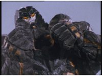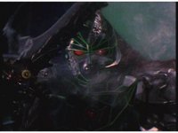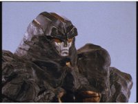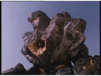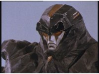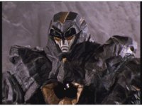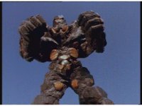 Mega Winger & Delta Megazord stagger back up against a mountain, Psycho Black fires eyebeams that creates restraints on their arms and legs, binding them to the wall. |