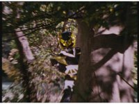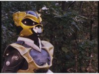 The Rangers rush off to their Mega V Zords, as Psycho Yellow spies on them from behind a tree, vanishing in a flash of yellow. |