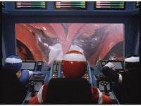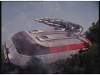 The Rangers pile into the MegaTank, before the Astro Megaship opens its docking bay, and the MegaTank rolls out from it. |