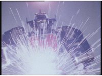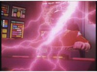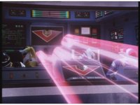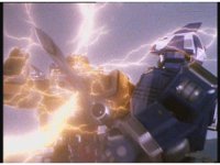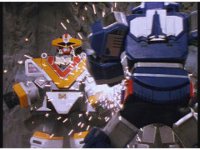 Astro Megazord maintains the saber-contact with Mega Voyager, which still crackles and writhes. Red looks concerned for his teammates as they suffer, but Blue seems to protest his stopping, so he presses a few more keys reluctantly, increasing the power, agonizing the Rangers, and Psycho Yellow, some more. |