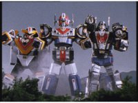 The three Megazords lower their arms, victoriously. |