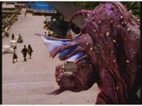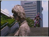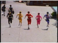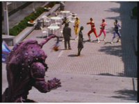 Jakarak is approaching the stoned humans, when the five Rangers race onto the scene, talk at him, he replies and they have a pose-off pacing. |