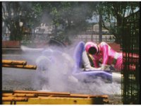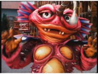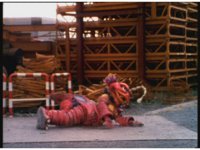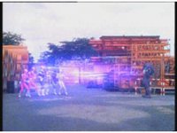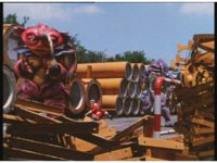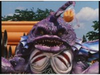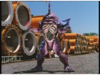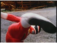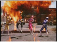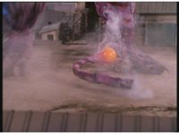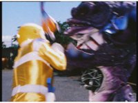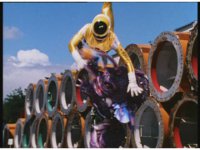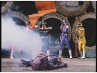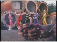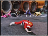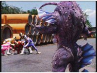 The four Rangers battle with Jakarak, who sparkily slashes them, then grips Yellow and flings her aside, where the Rangers regroup with her, until he fires his dangle bulb beam, they dive out of the way and it turns some old tires to stone. |