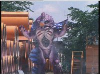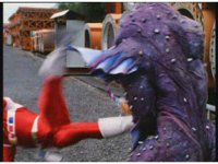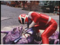 Red kicks Jakarak away, then engages him in combat, pulling him down for a roll, but the monster grabs and tosses him off. |