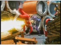Red leaps in and does a headbutt into Jakarak's chest, knocking him back, but he recovers quickly, so Red rushes in, and dives over his golden beams, making his way up close so he can kick him in the gut. |