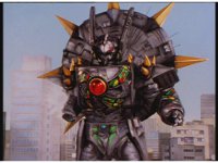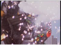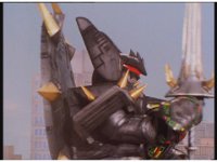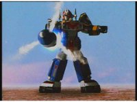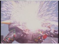 Mega Voyager rushes over and thrusts sword sparkily into Tankenstein's head region, bursting brightly. |