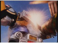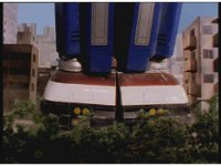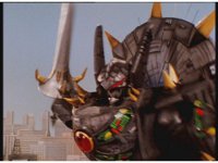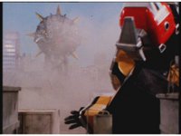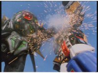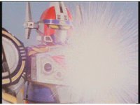 The blue shimmering ball of power slams into Tankenstein's defensive right arm, exploding it into falling off, which the Rangers celebrate. |