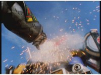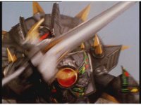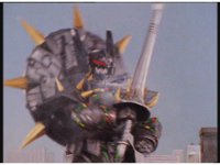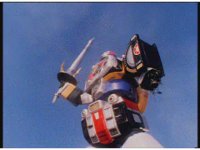 Mega Voyager charges forth, Tankenstein fires an energy ball forth, it sparks around the Megazord, which doesn't stop, soon jumping up, doing a flying punch into the monster, that causes it to lose its sword. Mega Voyager catches the sword in its one hand, and poses with it. |