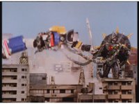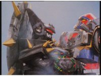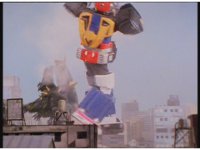 Mega Voyager staggers back, jumps up, throws a kick, Tankenstein grabs its leg, and uses it to fling the Megazord away. |
