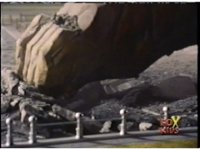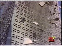 Close on side of gray building as a shower of debris, dirt, and rubble pours down parallel to it. |