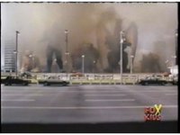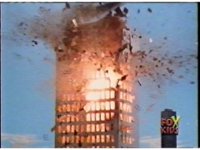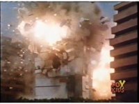 Mirrored-windowed building erupts explosively from within, all sides at once spewing forth dust and debris. |