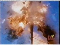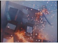 Mirrored-windowed skyscraper erupts outward from within, spraying debris onto the many surrounding buildings. |