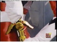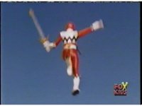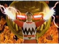 Red Galaxy Ranger charges up his Quasar Saber with red energy, flames surrounding him, before he slashes it forth. |