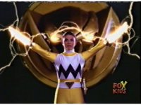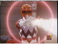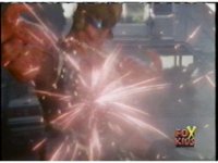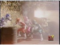Ranger colors streaks of energy crash down around Radster, exploding the area around him, until he's thrown off his feet, the Rangers reacting. |