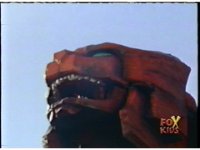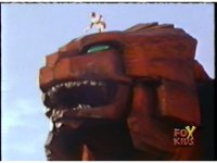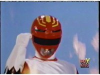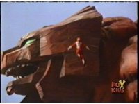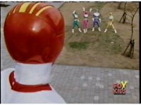 Red looks up at Lion, who looks back down at him, the other Rangers all exchanging glances, as Red responds with a pointing at himself, to which Lion roars. Red looks to our right quickly, then nods and leaps up at the Galactabeast. |