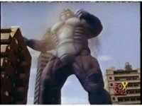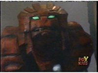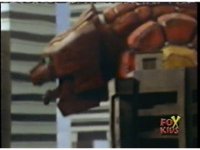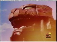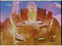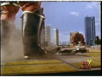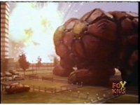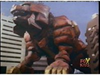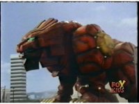 Radster rotates as he grows gigantic, the Rangers react, he steps down on them, they dive out of the way and one or two talk. |