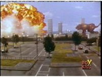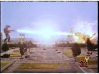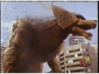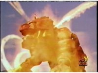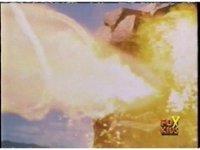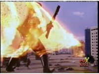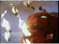 Eventually, Lion's flame stream overtakes the monster's beam, and overwhelms Radster, engulfing him in the blaze that disintegrates part of his body before he explodes massively, sending chunks of debris raining down on Lion and the Ranger atop. |