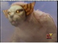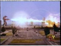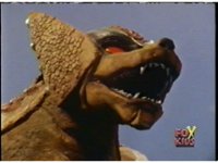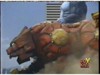 Radster points his gun forward, Red gestures his crossed hands forth. Radster fires his gun's energy beam at Lion's mouth-spewed stream of fire, the two colliding in the middle. Lion's feet begin to slide back from the force, the Rangers watching anxiously. |