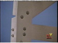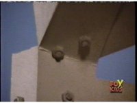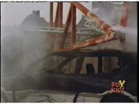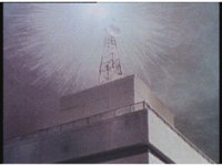 Close on upper roof area of building, as the antenna at the top spark bursts, quickly causing the rooftop structure below it to explode into debris. |