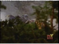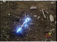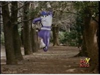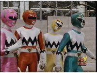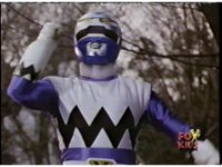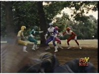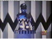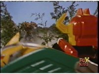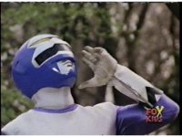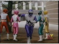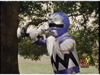 The Rangers regroup around Blue, as Quakemaker recovers, talks, then leaps out of there, fleeing the scene as the Rangers watch. Blue talks, then turns and runs away quickly, gesturing back to his teammates and doing a happy jump, which the Rangers appear bemused over. |