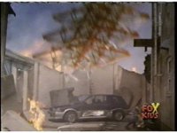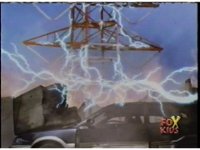 The power line tower crashes down upon the car, as Kai (shh!) carries the guy and box to safety. |