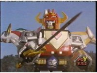 The five Galactazords race along to our left, zoom in on Lion as the backdrop changes to a blur of greenery, the Lion, then the Gorilla, then Condor, transforming into component parts. The head and horns pop out of the Lion section as it floats up, Wild Cat & Lion becoming arms, as all five Zords come together to form the Galaxy Megazord, with its saber forming in a crackle of electricity. |