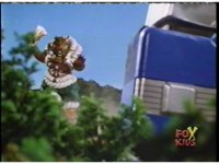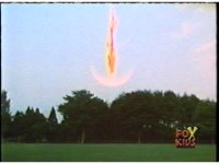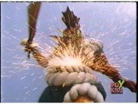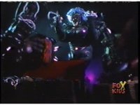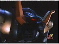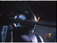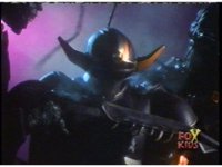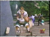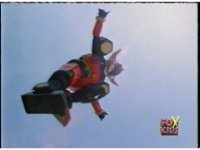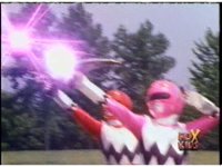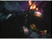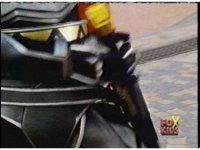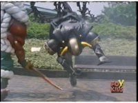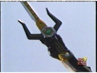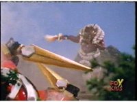 Fishface rushes forth, blade ready, when Red & Pink fire their Transblasters from below, spark bursting him. He then turns his attention toward the Rangers on the ground, slashing his fin blade down at them. Mega Defender blocks his slash and sparkily slashes back. |