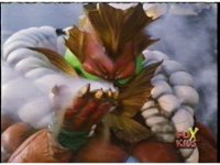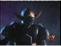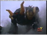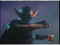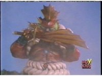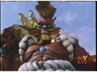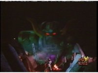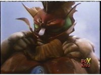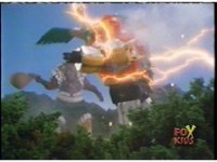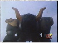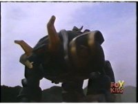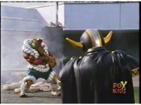 Torozord's horns glow red, as he charges forth at Fishface, who doesn't have time to react, ending up getting flipped completely over. |