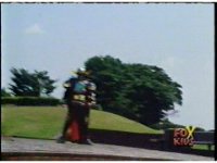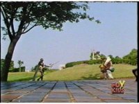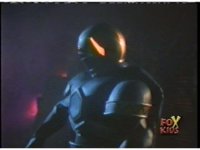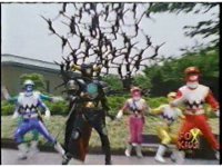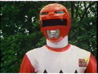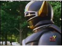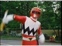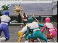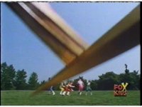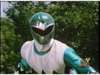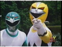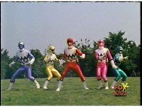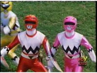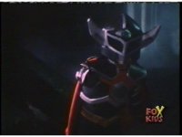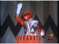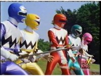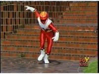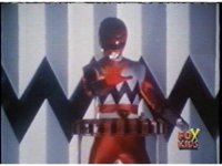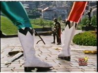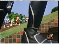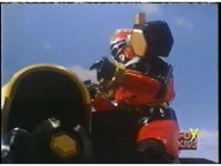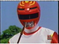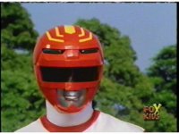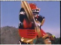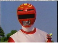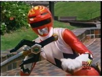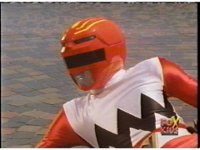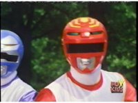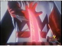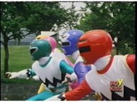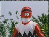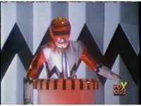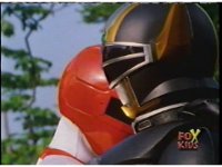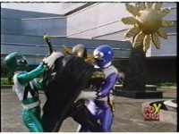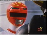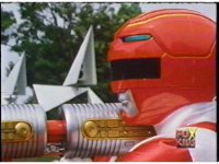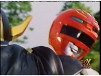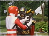 The Rangers continue watching, Yellow talks, then Red responds, before posing. Fishface notices just as Red lunges at him, locking fin blade to Quasar Saber. |