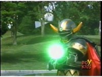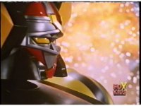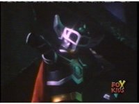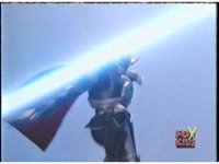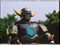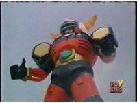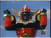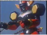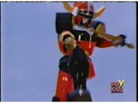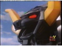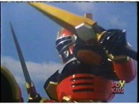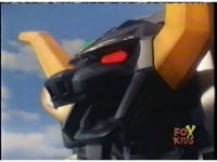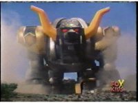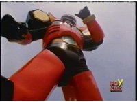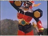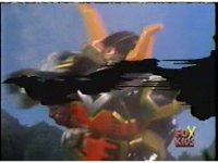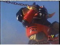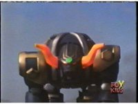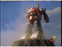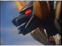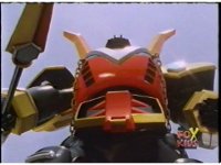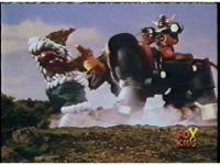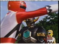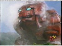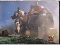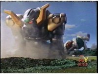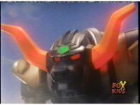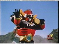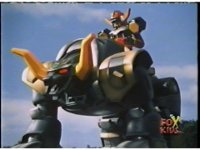 Torozord fires eyebeams down upon Magna Defender, causing him to grow gigantic and transform into Mega Defender mode. |