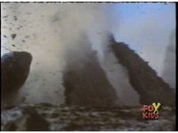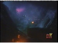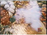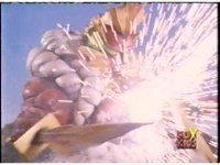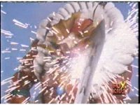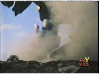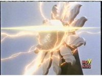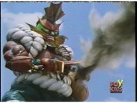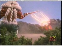 Fishface responds by aiming his blast bag and firing a sand burst at Galaxy Megazord, sparking it, shaking up Red in his cockpit. |