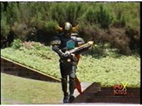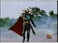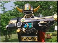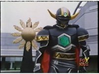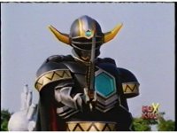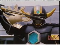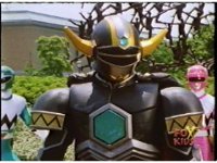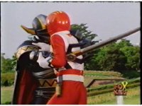Magna Defender shifts his weight while keeping his sword held forth. The Rangers make the scene, and see the monster with hostage, facing Magna Defender. |