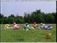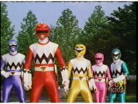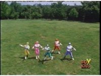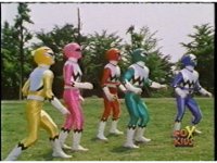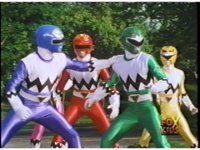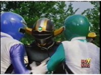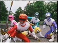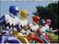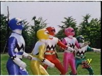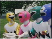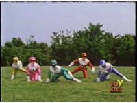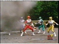 The Rangers watch, Blue then talking to Green before they, and Pink, rush off to the side. |