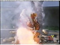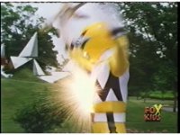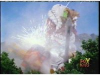 Defender Torozord ceases spinning and lands, standing facing away, as Fishface spark bursts, collapses, and explodes massively. |